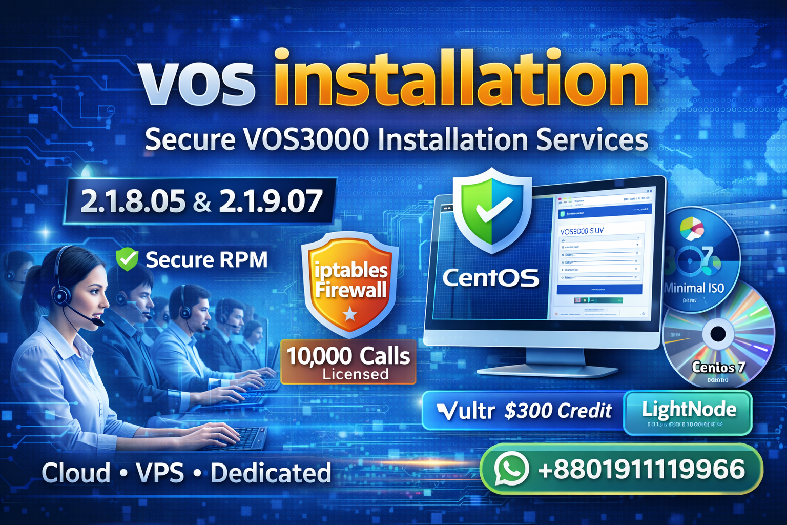 vos installation service with secure RPM, CentOS7 setup, firewall protection, VOS3000 2.1.8.05 and 2.1.9.07 deployment. Clean install, multi-IP license, API…